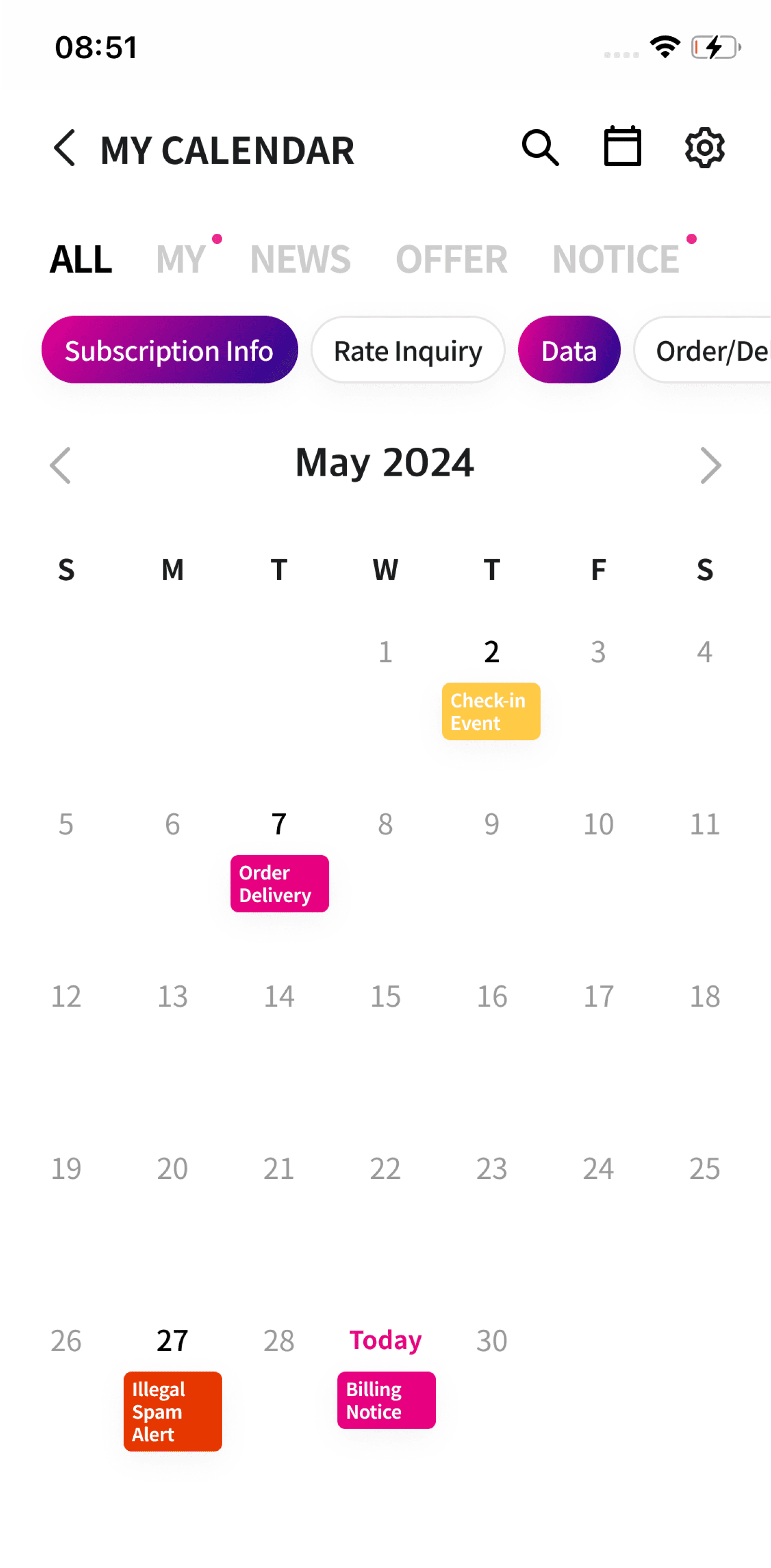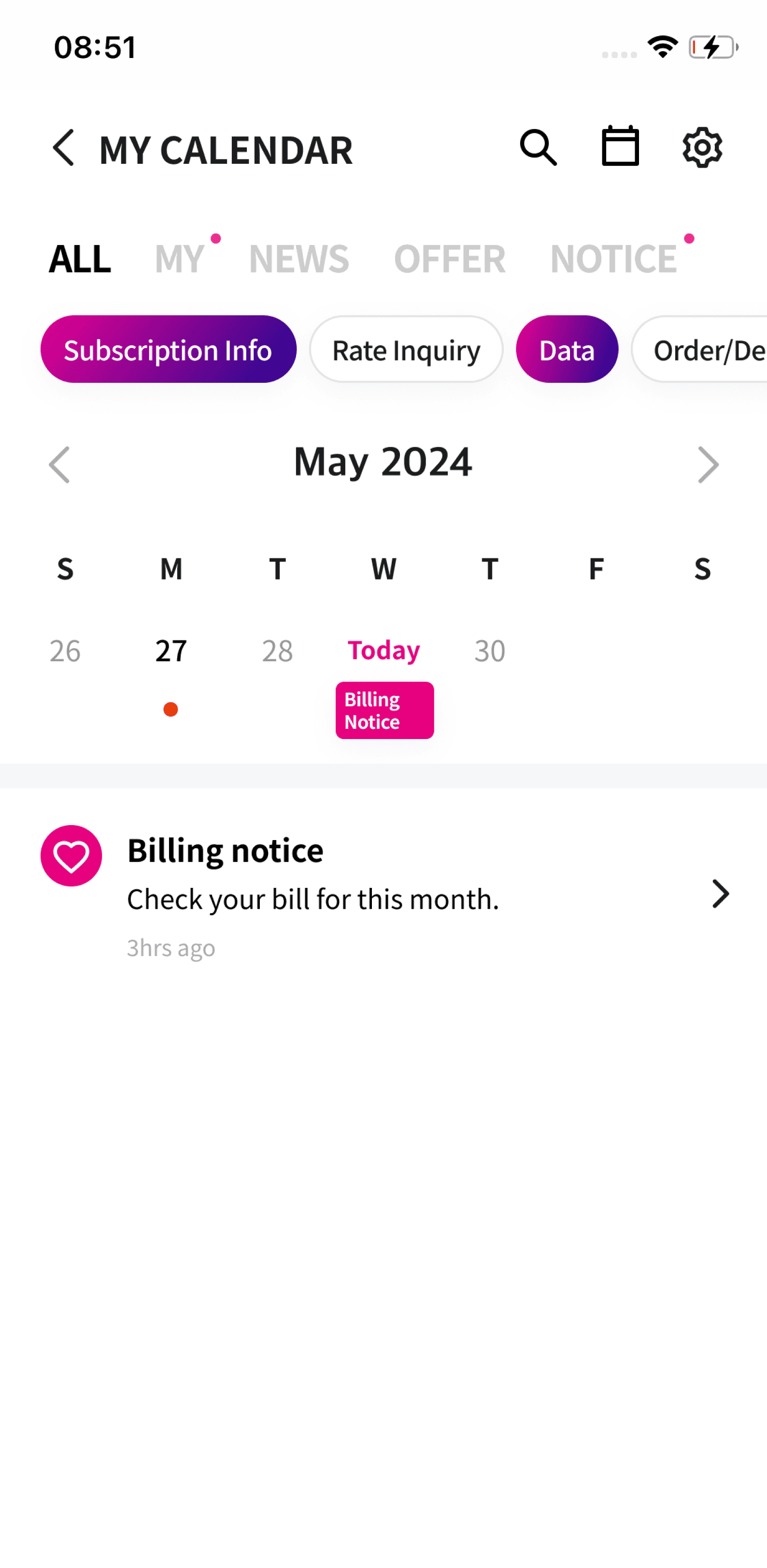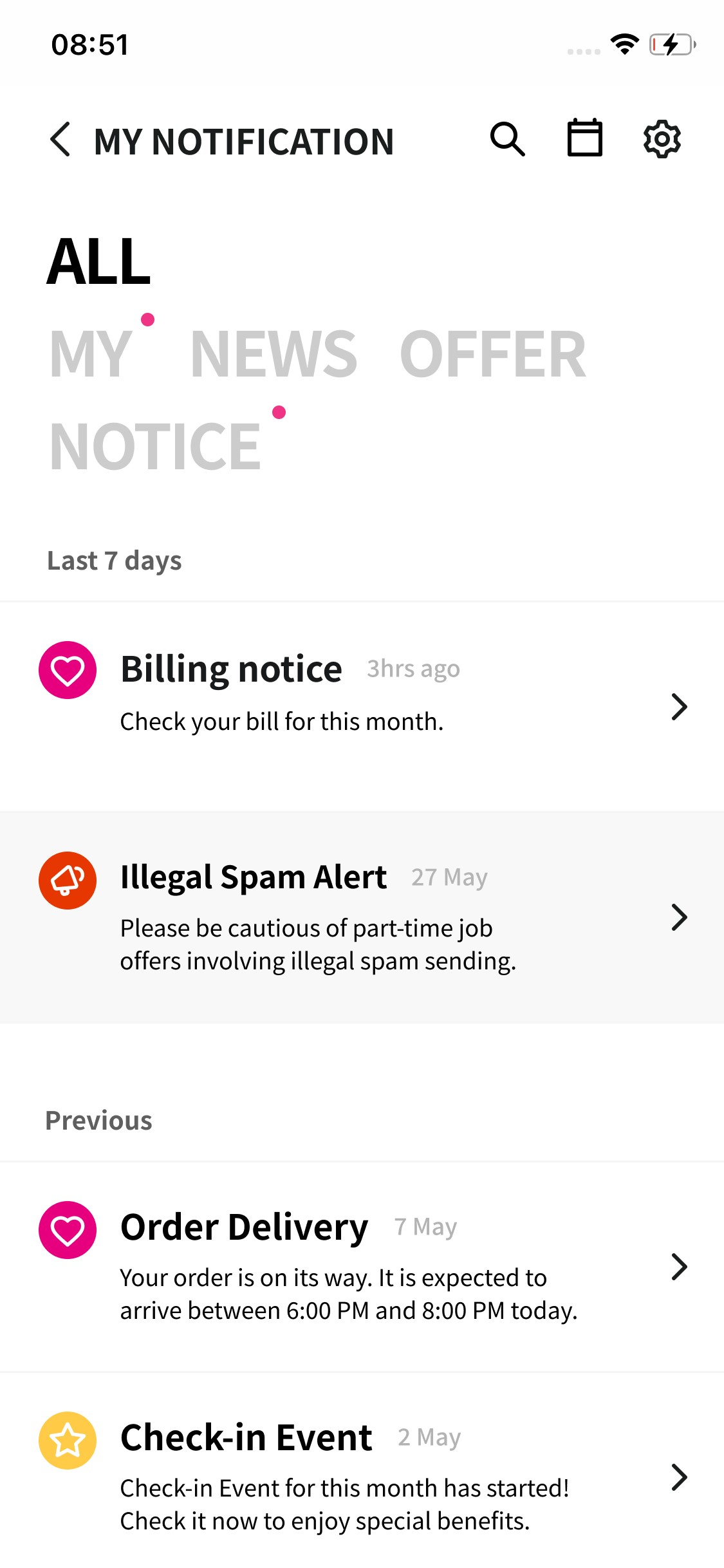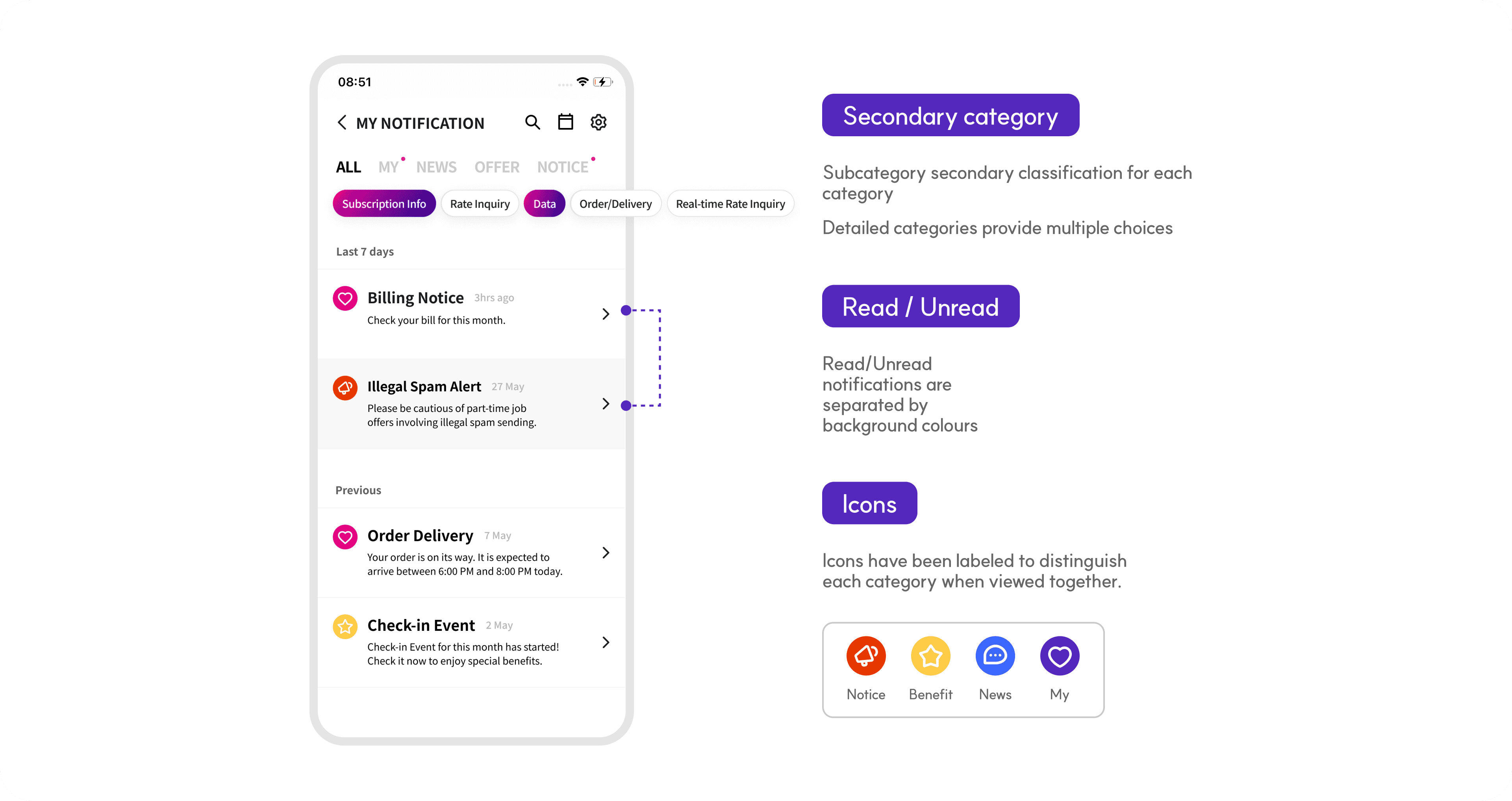 Notifications appeared in a single uniform list, making it hard to understand each message type or identify what was relevant. Users also struggled to retrieve past records such as previous bill payments or delivery updates.