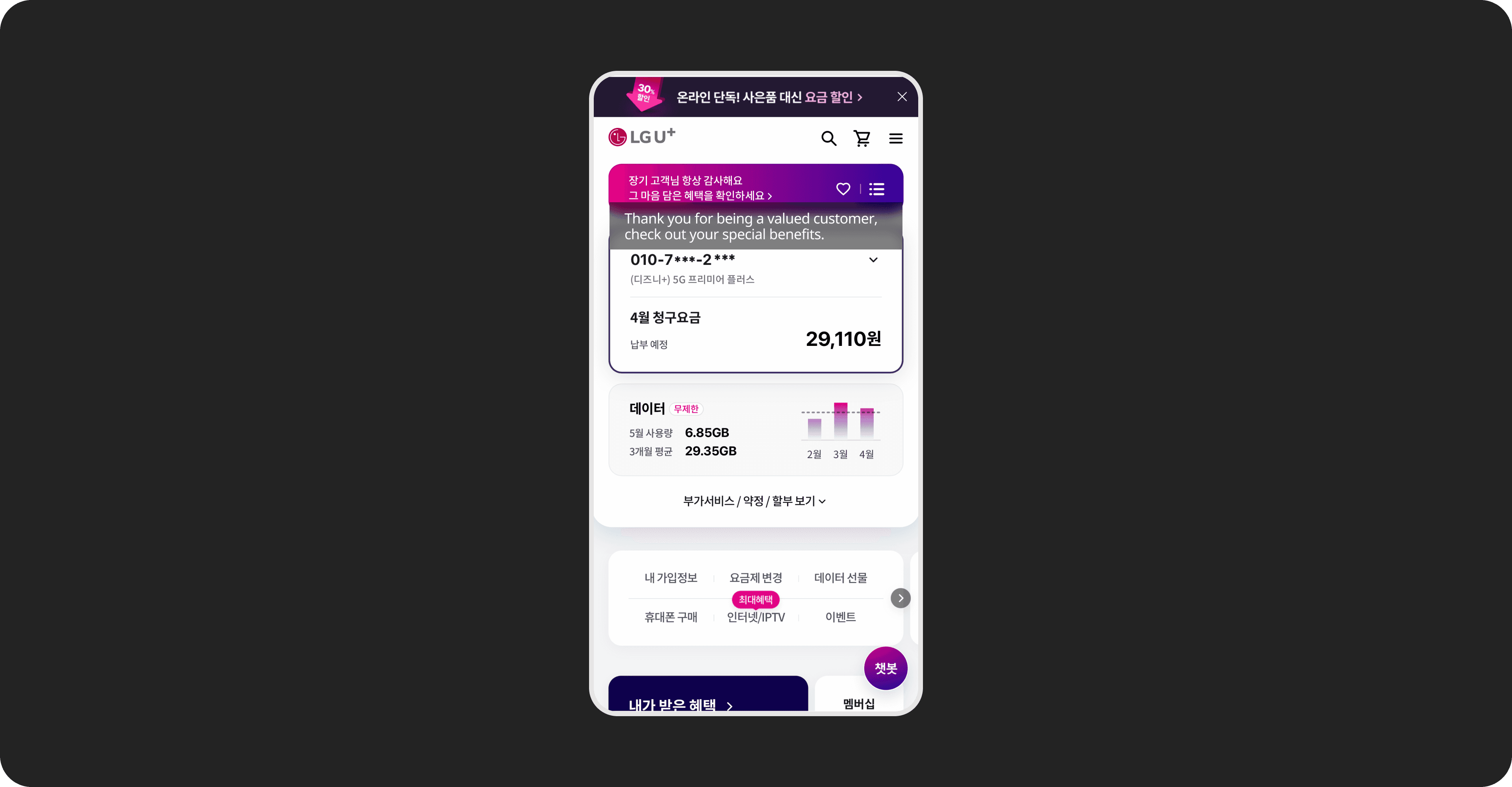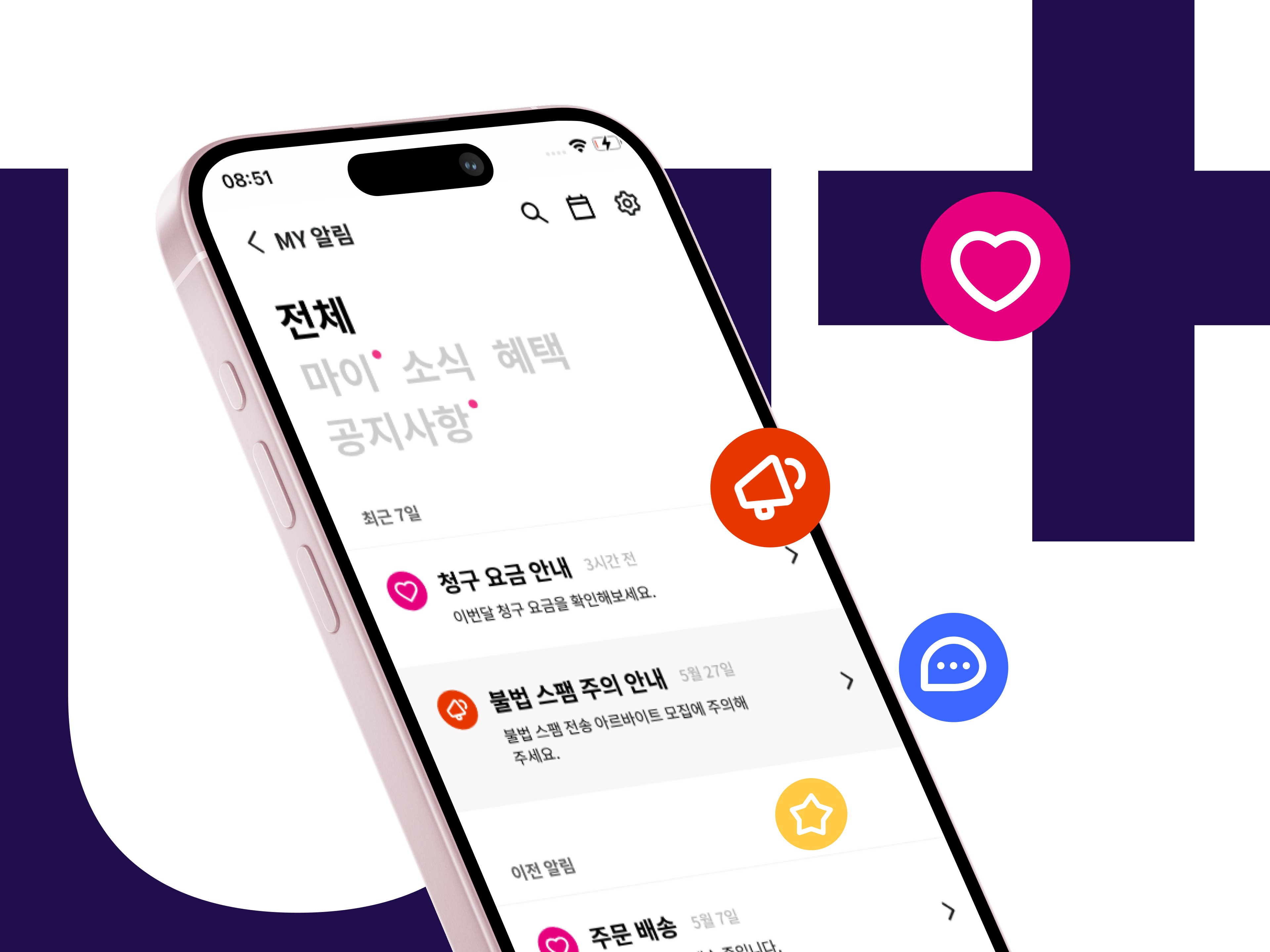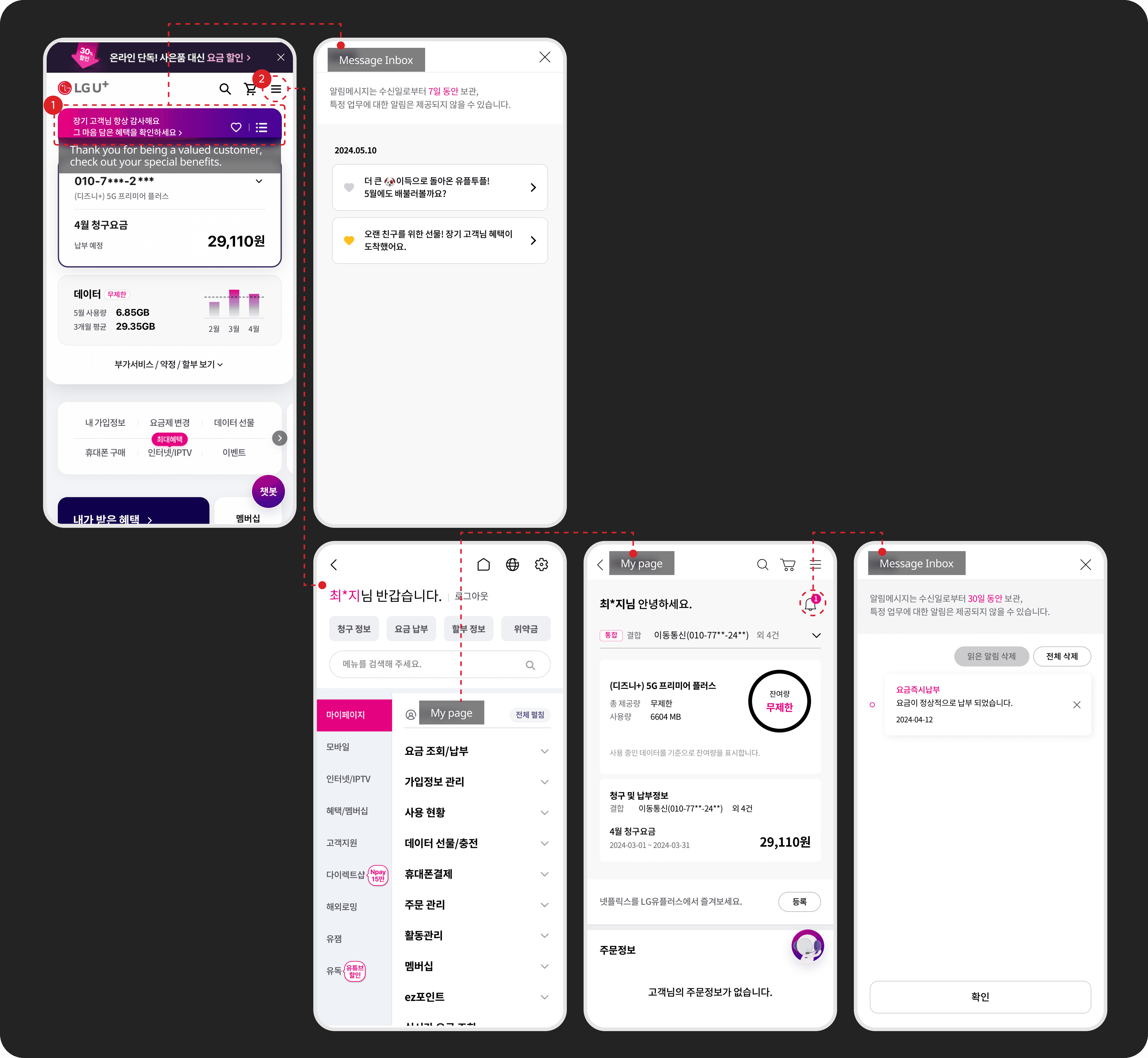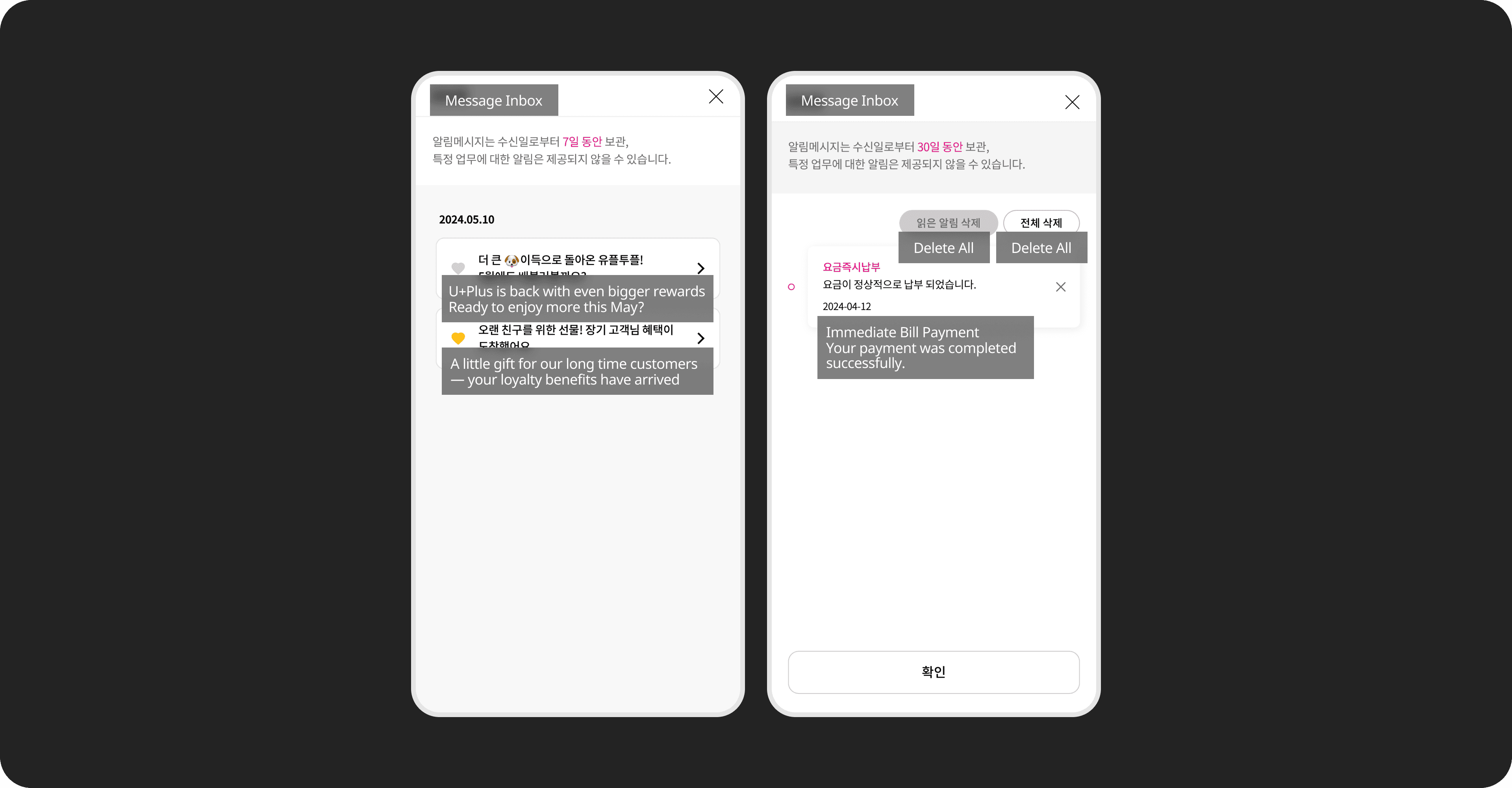 A focused redesign of the LG U+ notification inbox to clarify its identity, unify entry points, and structure messages for easier navigation and self-service. The updated experience enables users to find relevant information faster and complete key tasks directly within the app.